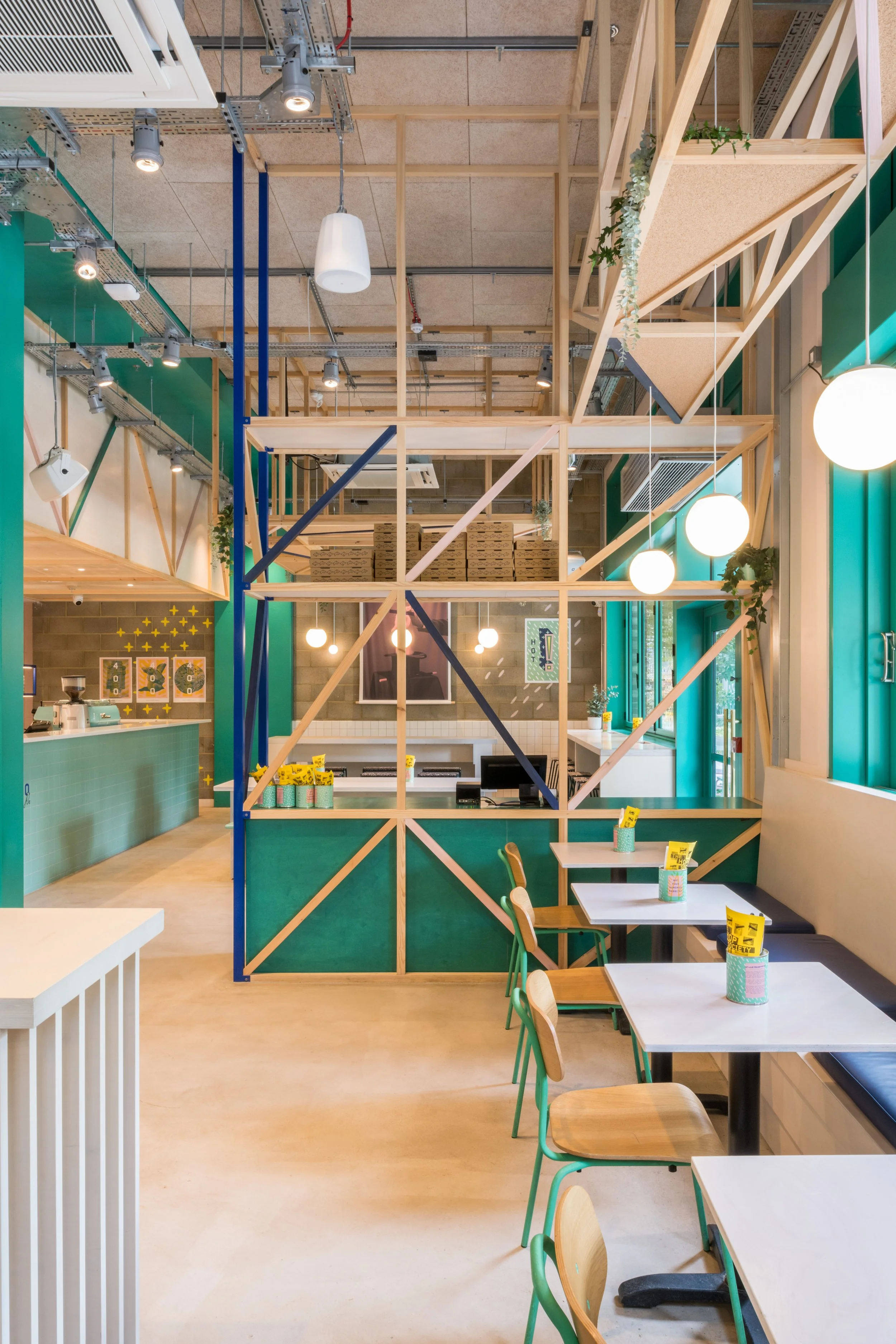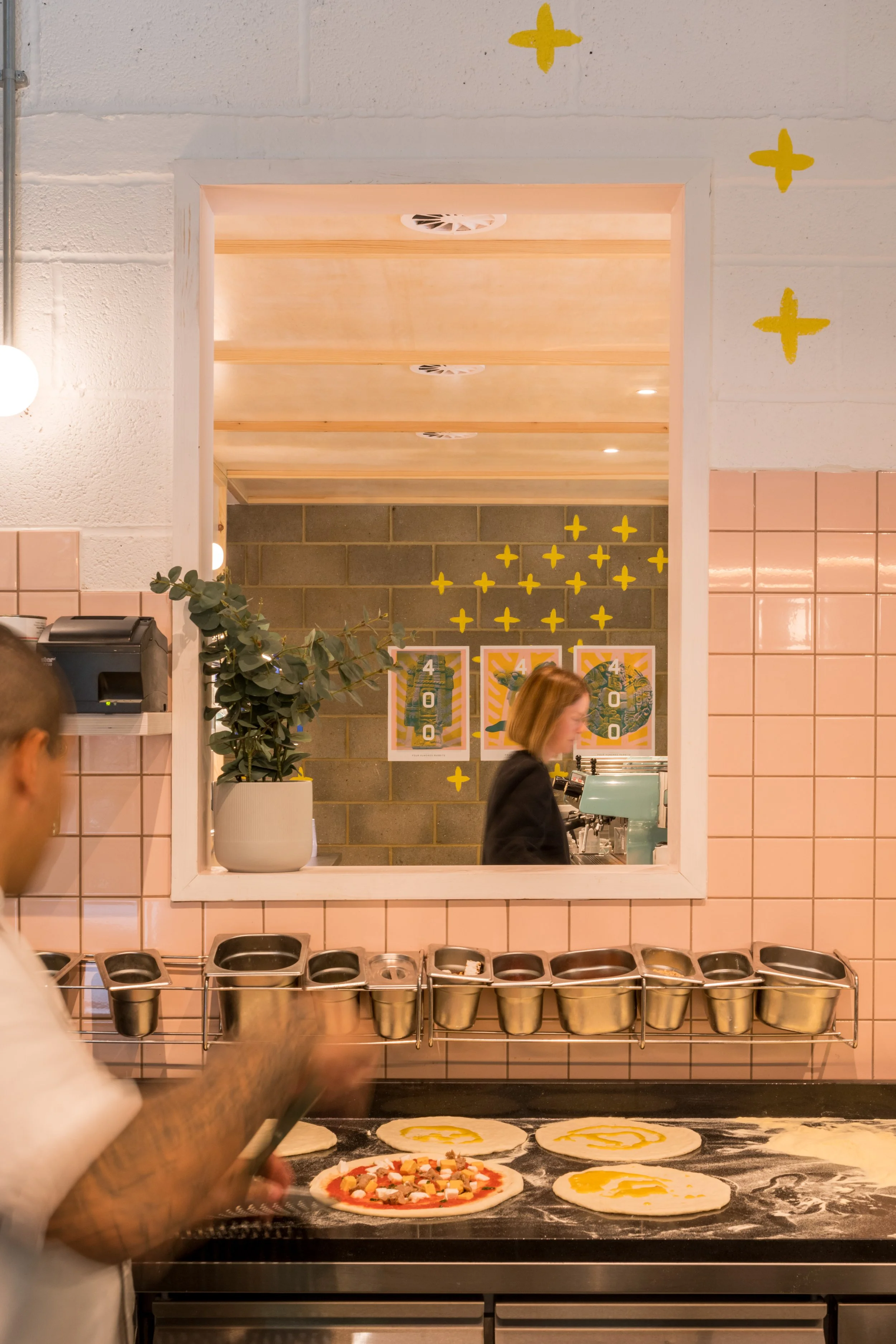 Bringing structures down from the ceiling and connecting the built-in furniture with the height above created a more intimate space for eating with the pizza oven in the centre the theatre of pizza making is visible to customers thought.