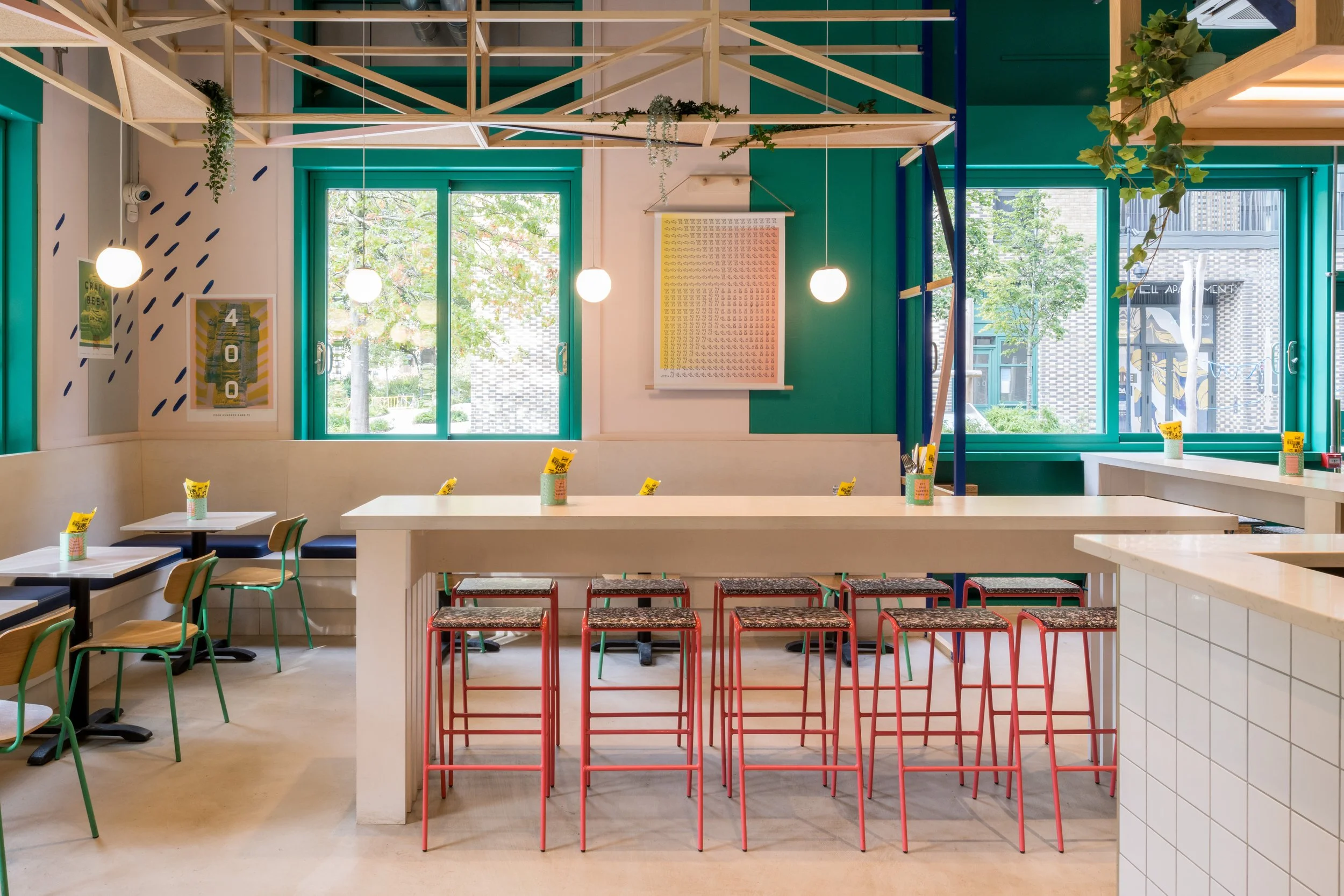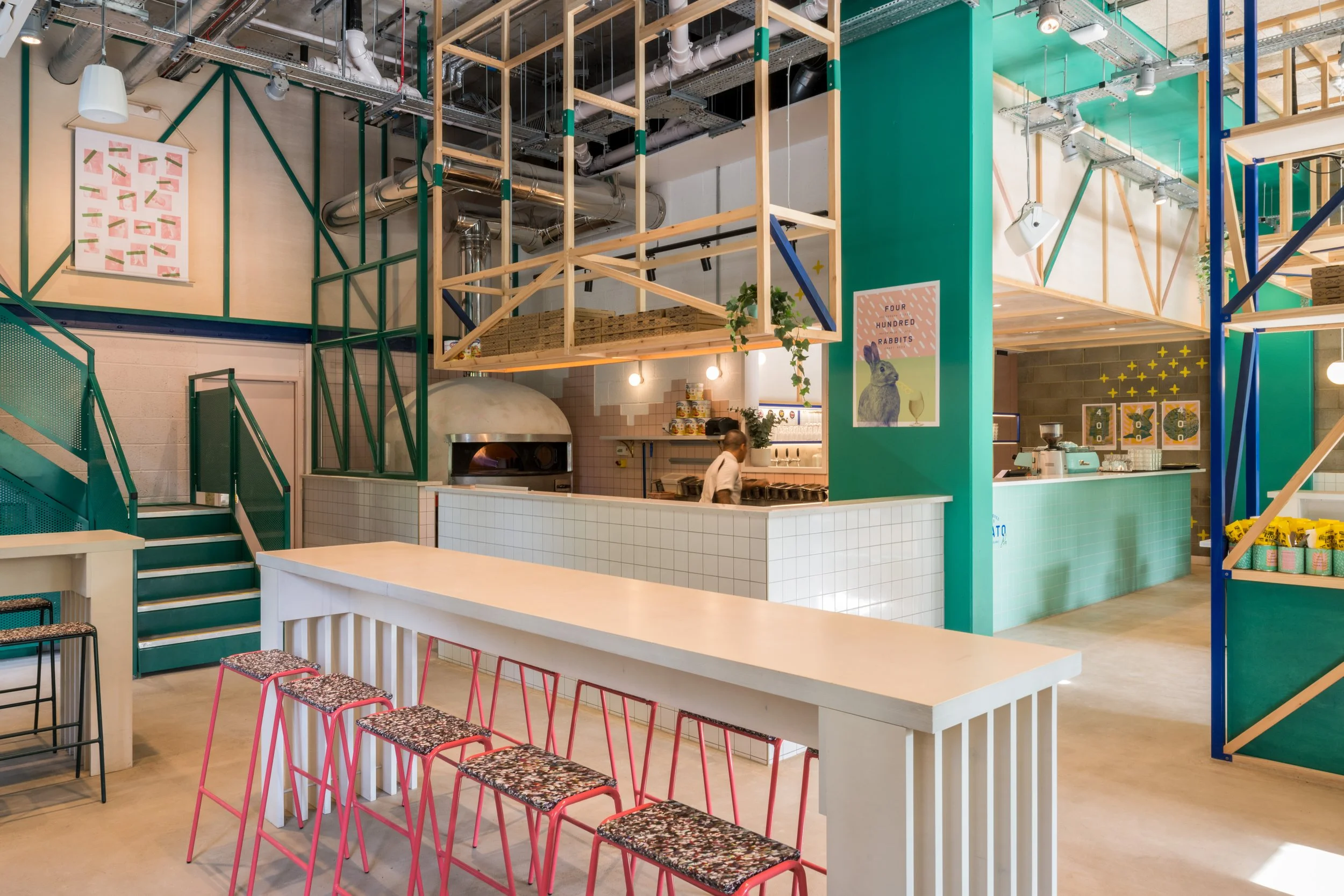400 Rabbits latest and biggest site was the kind of challenge I relish. A huge concrete space needing to be filled with the bright and fun aesthetic of previous sites but on a bigger scale.