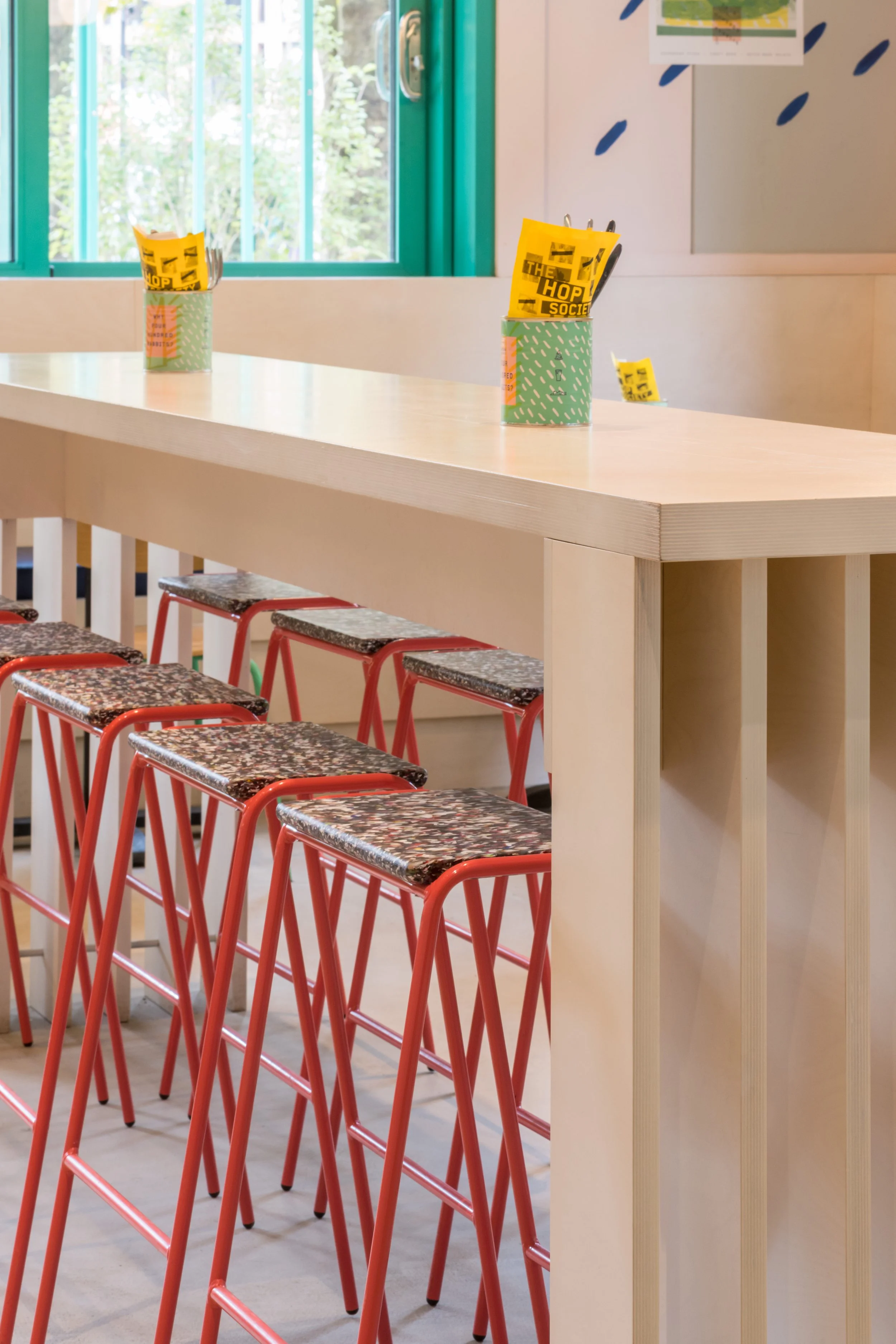The bright and clean colour palette sits against the raw bones of the building to give the space texture and interest. While the over sized windows are open onto London’s newest green park space connecting inside and out.